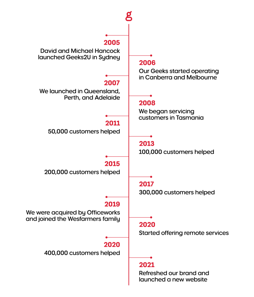 Geeks2U began in 2005 – the brainchild of David and Michael Hancock. The brothers saw a need to give Australians easy access to tech smarts, when and where it suited them.